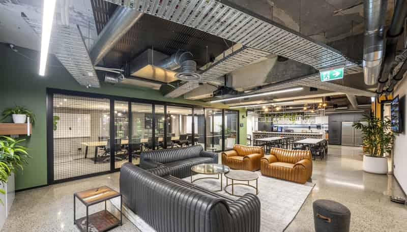 This light-filled workspace showcases industrial charm throughout, featuring exposed steel beams, a mix of concrete and brick walls, and impressive stud heights. The layout has been thoughtfully designed to support both function and style, starting with a striking front-of-house area that includes four meeting rooms, a large boardroom, and a generous kitchen area perfect for entertaining staff and clients.