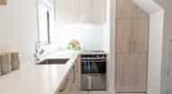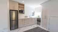 Kitchen with Fisher and Paykel dish drawer, electric cook top, oven, fridge and microwave