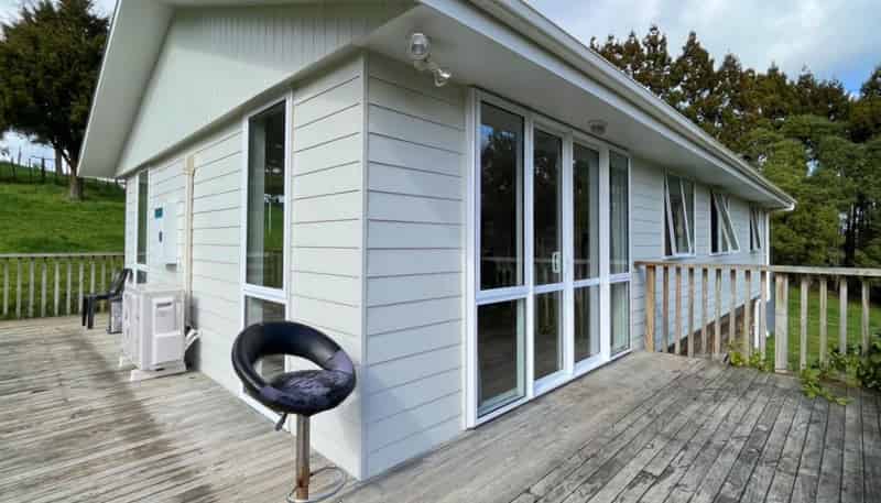 A heat pump is installed for year-round comfort. The living area opens out to a deck, providing an outdoor space to enjoy the surrounding rural environment.